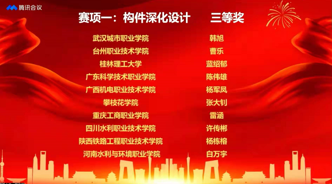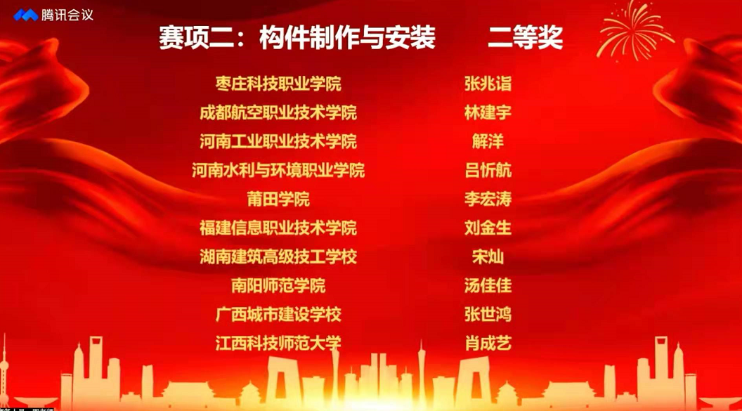 本届全国总决赛全国共有320余支队伍参加,采用线上比赛模式,分为构件深化设计和构件制作与安装两个竞赛单元,通过个人赛的形式全面考察参赛选手在专业理论知识、关键技术、软件实操等方面的专业能力和职业素养。在本次全国总决赛开赛前,经过第四届全国装配式建筑职业技能竞赛河南省选拔赛选拔,我系白万宇、吕忻航2名学生成功入围全国总决赛。面对全国各省的优秀选手,我系参赛选手顽强拼搏、沉着应战、认真作答,在两项比赛中均展示出较高的技术水平,经过两天的激烈角逐,最终获得佳绩。