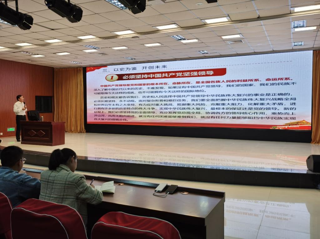 副校长黄功学从“光辉文献,政治宣言”、“丰功伟绩,恢弘史诗”、“以史为鉴,开创未来”三个方面讲解了习近平总书记“七一”重要讲话精神。他告诫同学们要坚定理想信念,紧随党的步伐,拥护党的领导,为实现第二个百年奋斗目标贡献自己的力量。