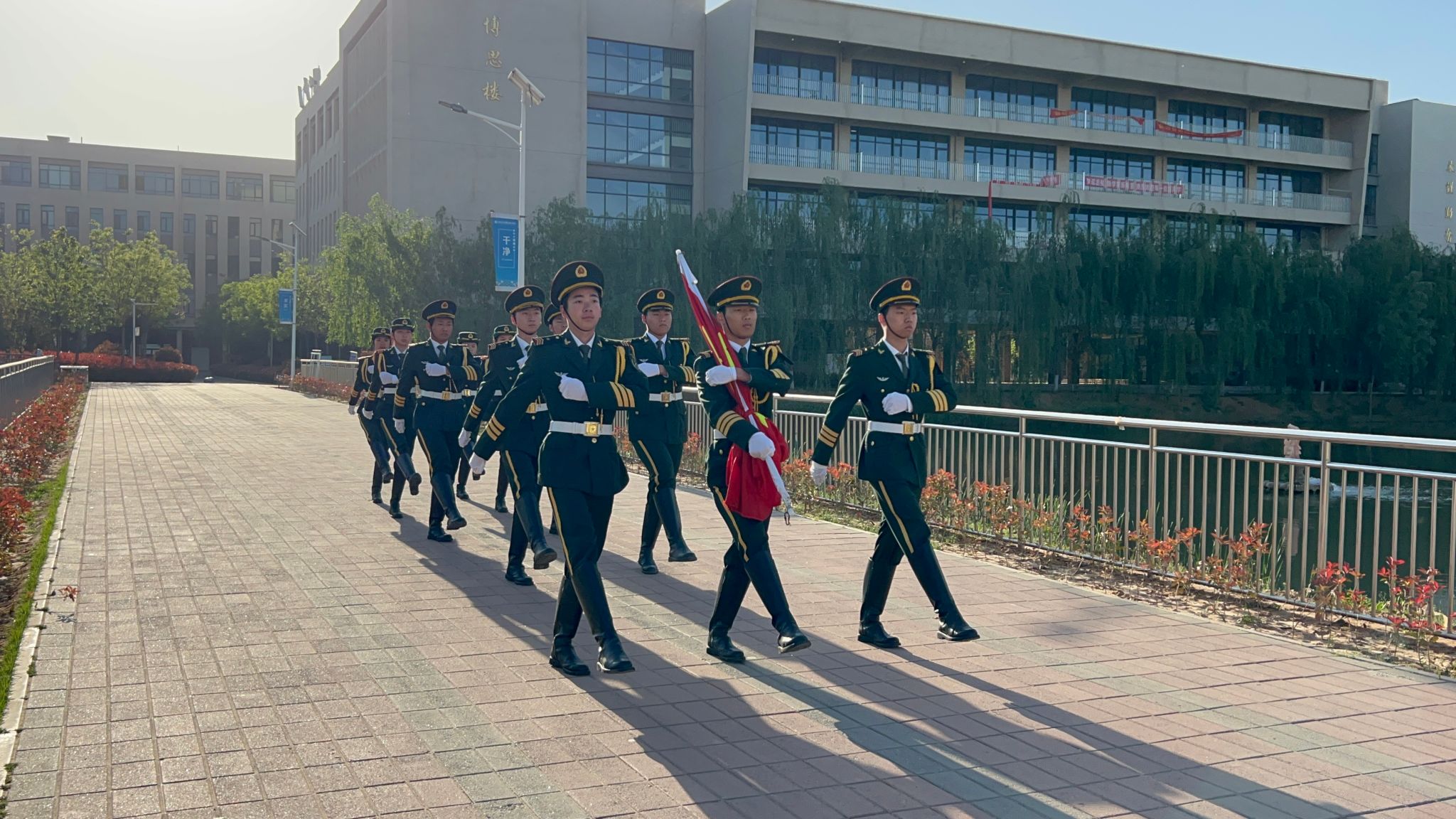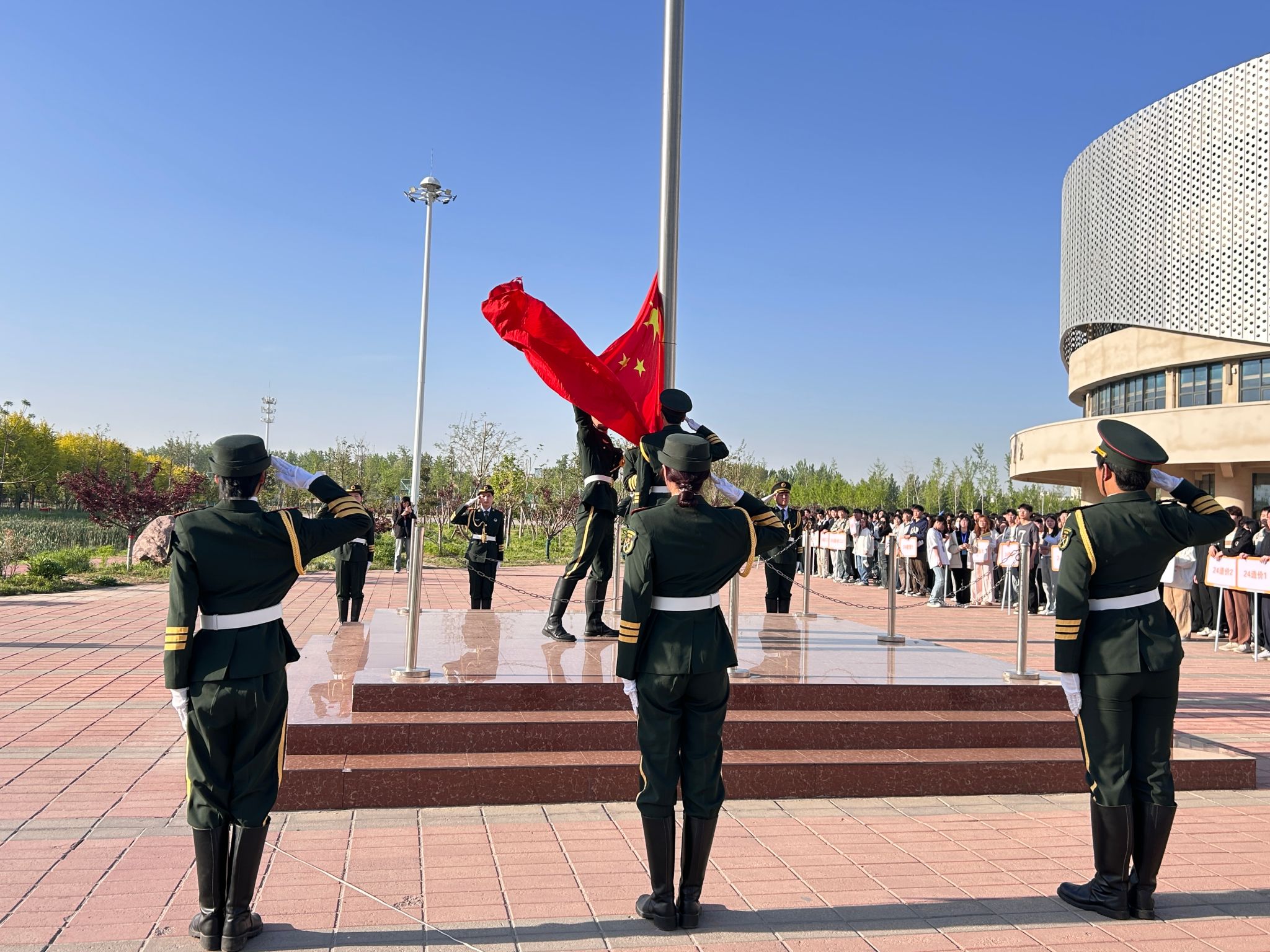 早上7:30升旗仪式正式开始。国旗护卫队迈着坚定的步伐走向升旗台,鲜艳的五星红旗伴随着《义勇军进行曲》冉冉升起。全体师生肃穆而立,向国旗行注目礼。
