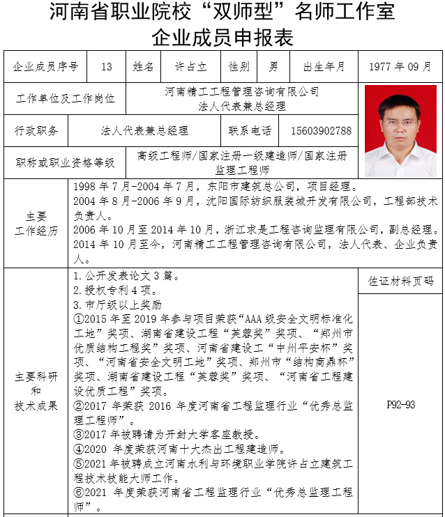 2023年五月,许占立技术技能大师工作室联合申报河南省职业院校“双师型”名师工作室。