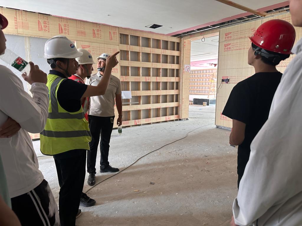 在项目部,项目经理介绍了项目的背景、目标、设计理念以及建设过程中的重要节点,着重强调了参观过程中的安全事项。进入施工现场后,项目监理人员和技术质量部工作人员结合施工现场的实际情况,为学生们详细讲解了办公用房与商业用房在功能和设计上的区别,讲解了PLC轻质隔墙施工优势、异形吊顶施工工序以及被动式建筑节能技术的相关理论知识。