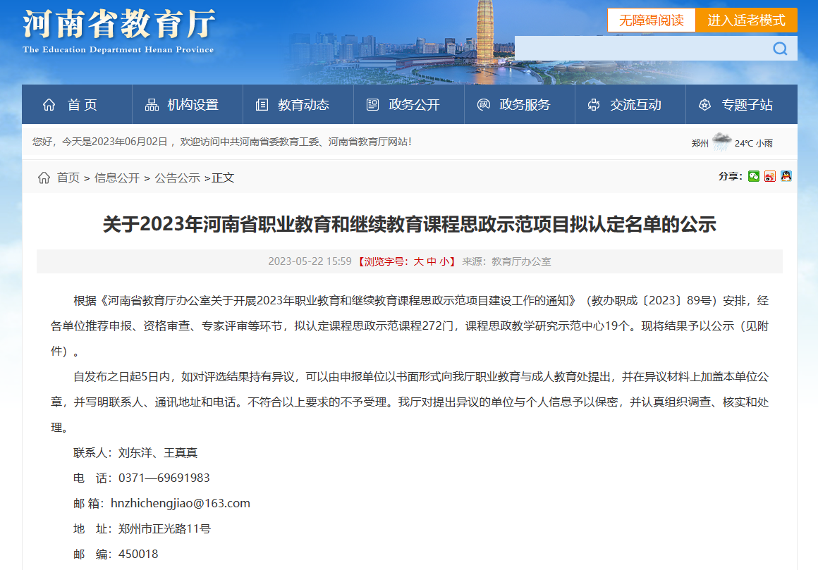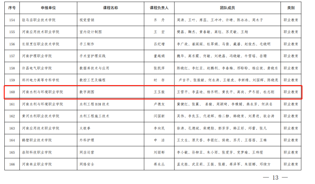 近日,河南省教育厅公示了2023年河南省职业教育和继续教育课程思政示范课立项名单,我校5门课程获批立项,我系《数字测图》、《装配式建筑混凝土预制构件生产》两门课程位列其中。