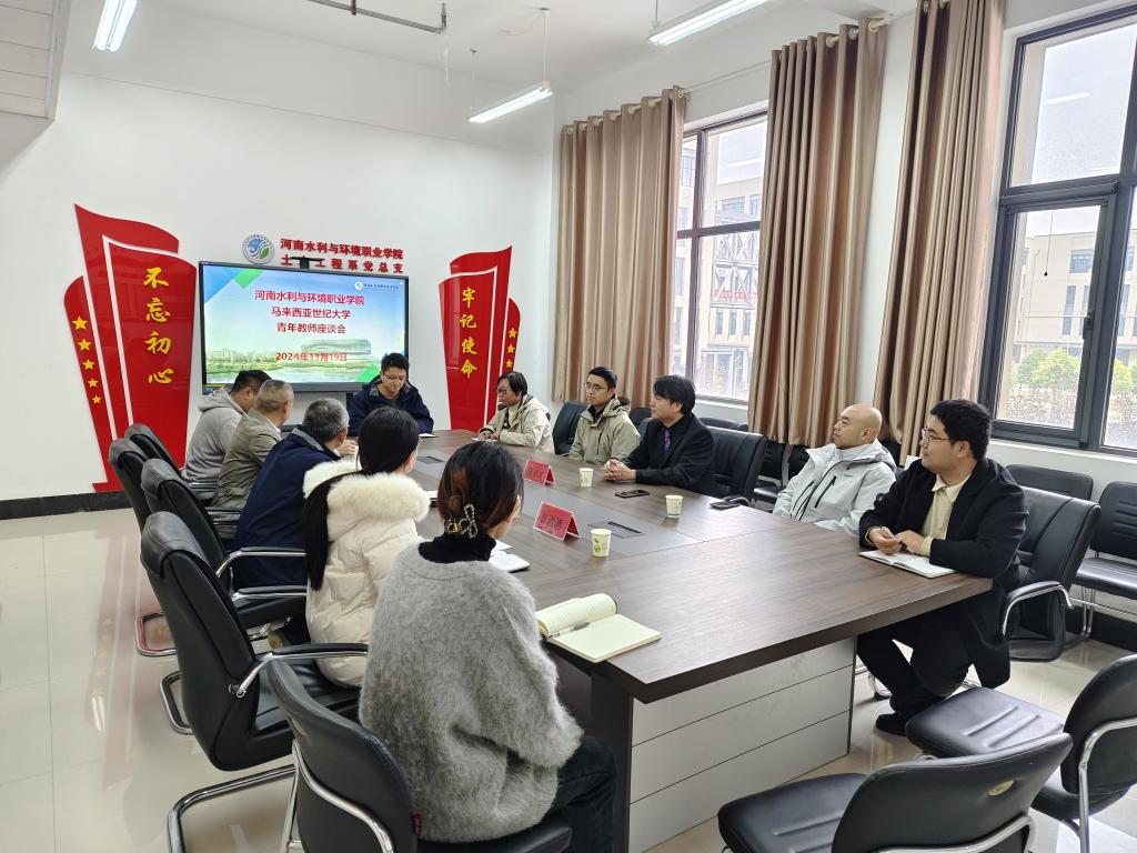 11月19日,我校在航空港校区举行中马合作办学交流会暨青年教师座谈会。马来西亚世纪大学工程学院院长陈永才,我校副校长包永刚,科研外事处处长梁超,环境工程系、土木工程系等部门负责人和相关教师,2023级、2024级中马合作班全体学生参加。会议由梁超主持。