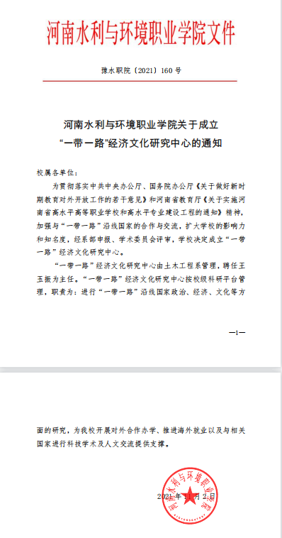 为贯彻落实中共中央办公厅、国务院办公厅《关于做好新时期教育对外开放工作的若干意见》和河南省教育厅《关于实施河南省高水平高等职业学校和高水平专业建设工程的通知》精神,加强与“一带一路”沿线国家的合作与交流,扩大学校的影响力和知名度,经系部申报、学术委员会评审,学校决定成立“一带一路”经济文化研究中心。